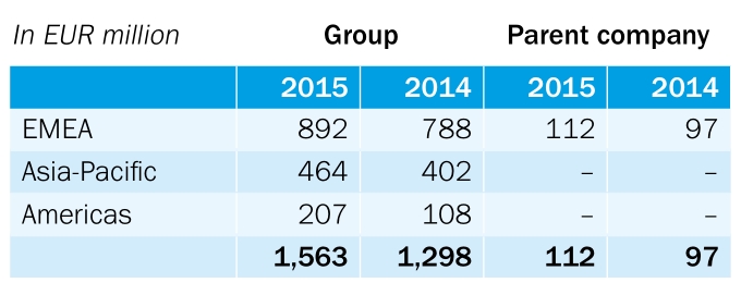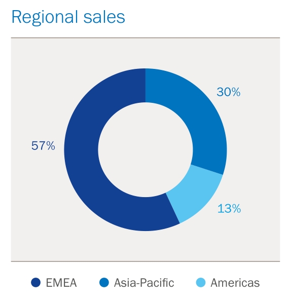 按区域销售来看,EMEA占比57%,为8.92亿欧元,同比增长11.66%;亚太地区占比30%,为4.64亿欧元,同比增长13.36%;美洲地区占比13%,为2.07亿欧元,同比增长47.83%。