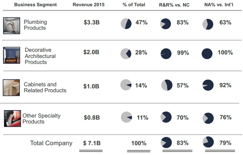 按业务板块来看,2015年马斯科柜及相关产品销售额为10.25亿美元,水暖产品销售额为33. 41亿美元,装饰建筑产品销售额为20.20亿美元,其他特色产品销售额为7.56亿美元。