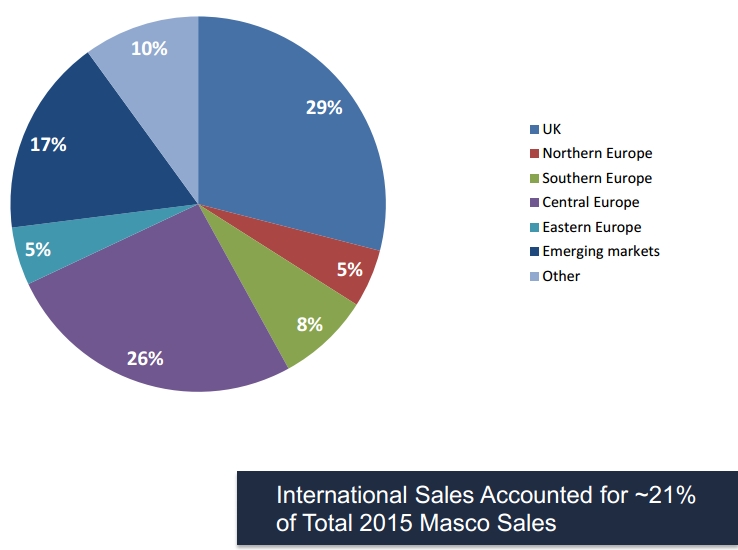 年报显示,毛利率由2014年的29.9%提升至2015年的31.6%;营业利润率由2014年的11.1%提升至13.0%。其中,马斯科2015年涂料销售额达20.20亿元(2014年:19.98亿美元),占集团销售比例为28%。