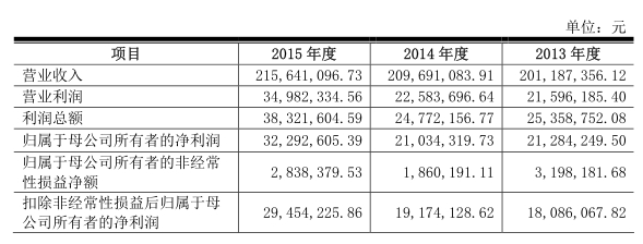 招股说明书显示,2015年实现营业收入2.156亿元,同比增长2.84%;净利润3229.26万元,同比增长53.52%。2013年-2015年公司净利润分别为2128.42万元、2103.43万元和3229.26万元,综合毛利率分别为35.78%、34.57%和38.34%。
