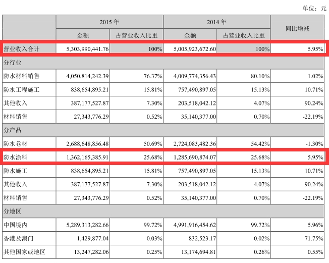 东方雨虹2015年营收53亿元 防水涂料销售额13.6亿元