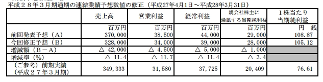 据悉,此前预测2016财年销售额为3700亿日元、经营利润为385亿日元、净利润为290亿日元,但业绩修正后,2016财年销售额为3280亿日元、经营利润为340亿日元、净利润为280亿日元。