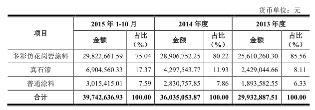 磐彩环保成立于2011年6月8日,磐彩环保主要从事建筑水性多彩仿石涂料的研发、生产与销售。公告显示,磐彩环保2013年度-2015年1-10月营业收入分别为2993.29万元、3603.51万元、3974.26万元;净利润分别为167.68万元、169.93万元、127.30万元。