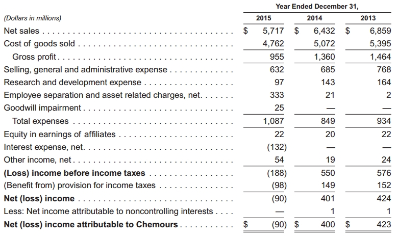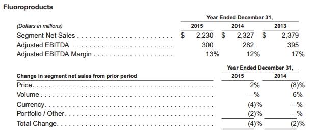 2月23日,科慕公司(Chemours)宣布2015年财报,全年实现净销售额为57.17亿美元,同比下降11%;调整后EBITDA为5.73亿美元,同比下降52.87%;调整后净收入为1.43亿美元,同比下降216.78%。