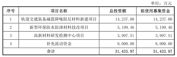 招股书显示,株洲飞鹿此次募集资金为3.14亿元,主要用于“轨道交通装备减震降噪阻尼材料新建项目”、“新型环保防水防渗材料技改项目”、“高新材料研发检测中心项目”以及“补充流动资金”。