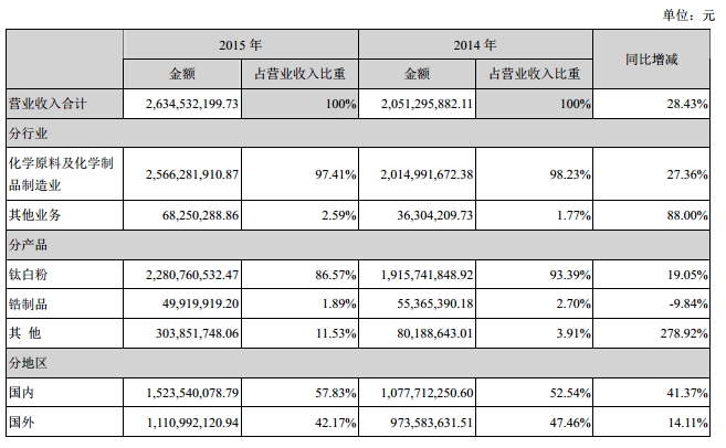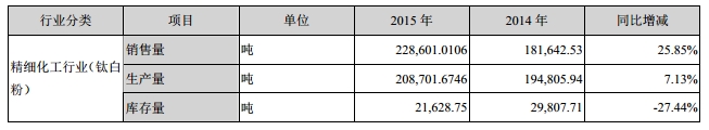 报告显示,2015年度,公司完成钛白粉销量22.86万吨,同比增长25.85%,其中国内销售钛白粉13.17万吨,同比增长41.35%;出口钛白粉9.69万吨,同比增长9.53%。