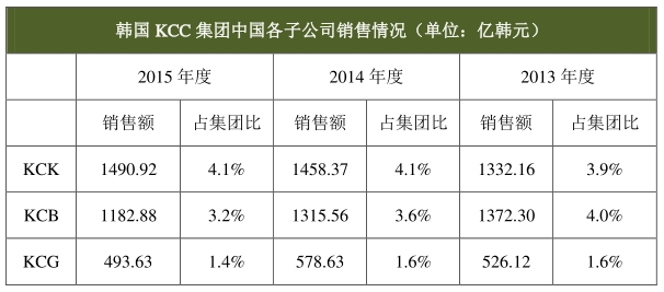 3月30日,韩国金刚高丽化工(KCC)集团发布了2015年度报告,报告期内实现销售额为34143.88亿韩元,同比增长0.43%,折合人民币187.79亿元;营业利润为3092.10亿韩元,同比增长11.58%;净利润为1850.53亿韩元,同比下降76.54%。