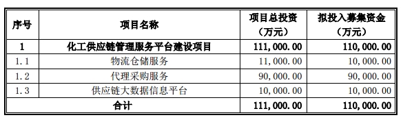据了解,本次募集资金将用于建设化工供应链管理服务平台,开展化工领域的物流、仓储和代理采购等供应链管理服务,并与产业链上核心企业合作,搭建信息流、物流、商流、资金流整合的供应链大数据信息平台,为企业提供包括仓储、物流、代理采购等一站式的供应链管理服务,降低企业的供应链成本,为产业链顺畅运行提供资金和服务支持,促进产业协调健康发展。