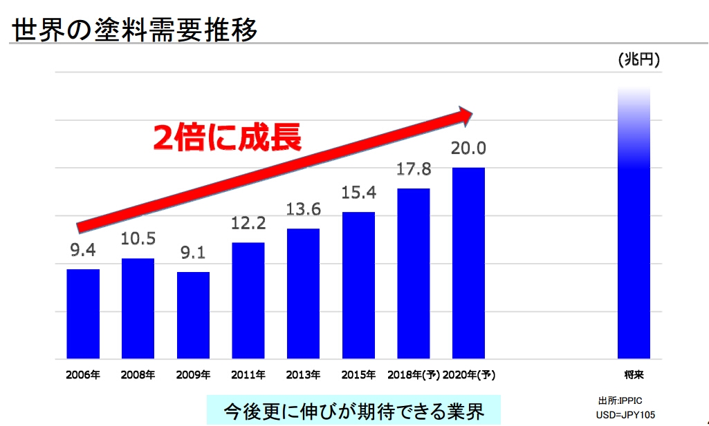 日涂控股计划到2018年12月,将合并销售额提高至7000亿日元,比目前提高30%,长期目标为1万亿日元。(涂界)