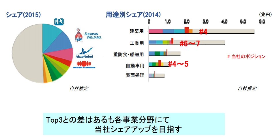 日涂控股在中国将通过新建工厂和扩大店铺网,将在中国室内装修涂料市场的份额从目前的30%左右最高提高至50%。“在中国已获得压倒性品牌地位。立邦中国2014年-2015年住宅装修市场份额分别为25.7%、29.1%,未来将超过50%。”