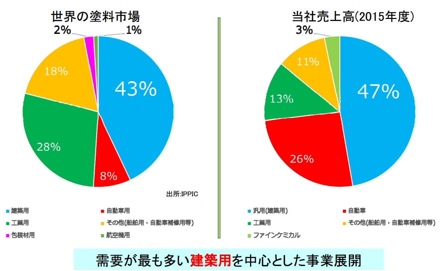 业务版块:涂料事业(5183.64亿日元),其中:汽车涂料(1387.55亿日元),民用涂料(2533. 54亿日元),工业涂料(682.81亿日元),其他涂料(579.73亿日元)。精细化工事业(173.81亿日元)