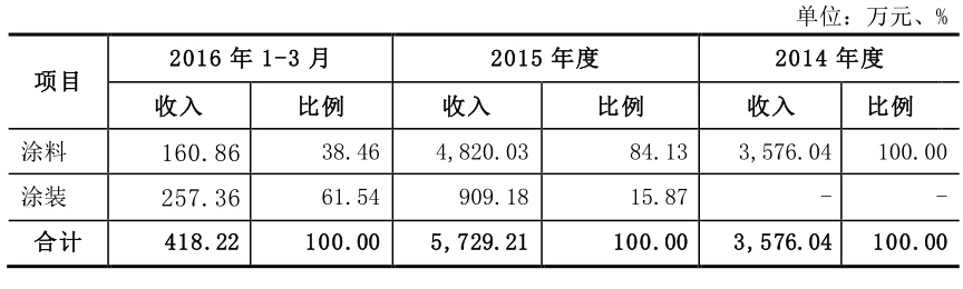 报告称,2015年,公司推出涂装施工服务。2016年1-3月涂料收入下降,主要原因为:1)2016年1-3月,深圳市正和诚信塑胶五金制品有限公司、深圳市正和忠信塑胶制品有限公司两家客户由于自身业务萎缩,未向公司采购商品;2)2016年公司开始业务转型,由传统的以销售涂料为主逐渐转向毛利率较高的涂料、涂装一体化服务为主,涂装施工服务收入占总收入的比重逐渐提高。(涂界)