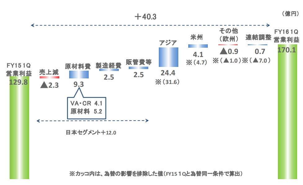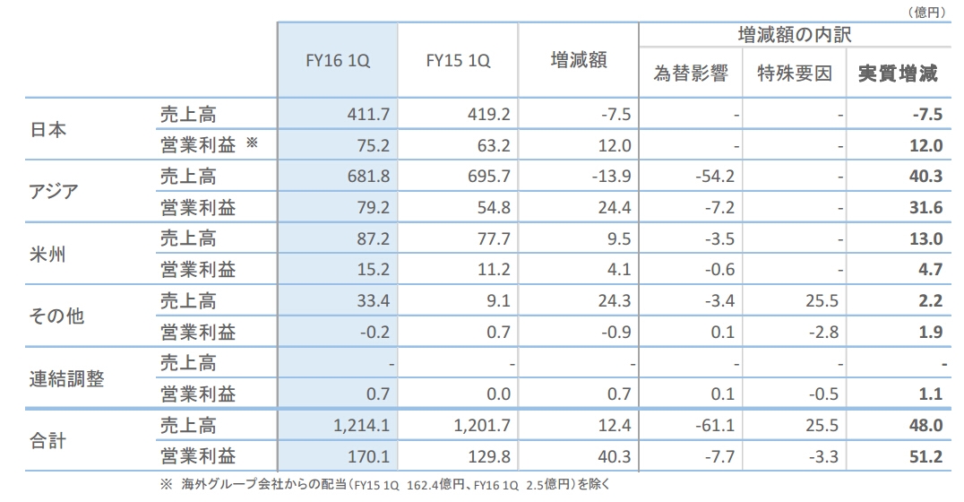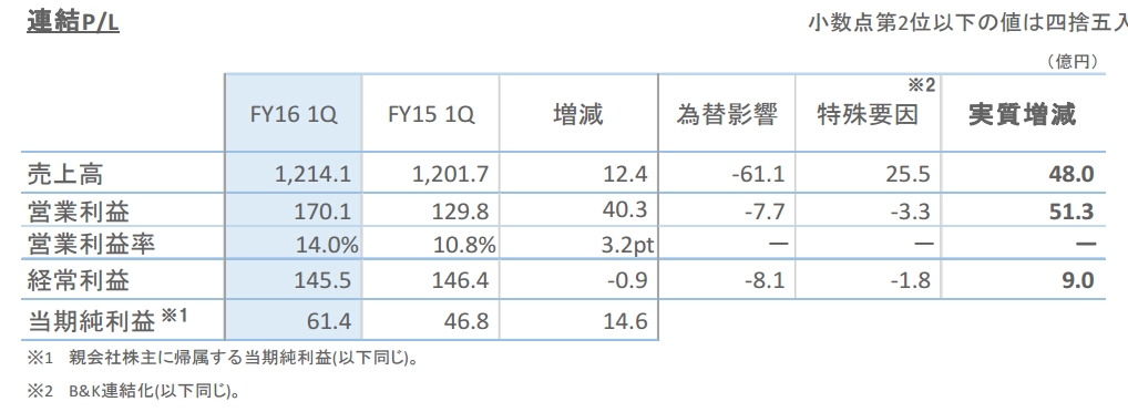 报告显示,日本地区重点客户份额扩大,同时受到熊本地震影响;亚洲地区在以当地货币的来计算,销售额增加;由于中国汽车市场的情况良好,汽车漆、民用涂料销售额增加。