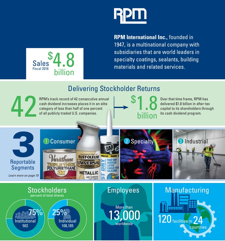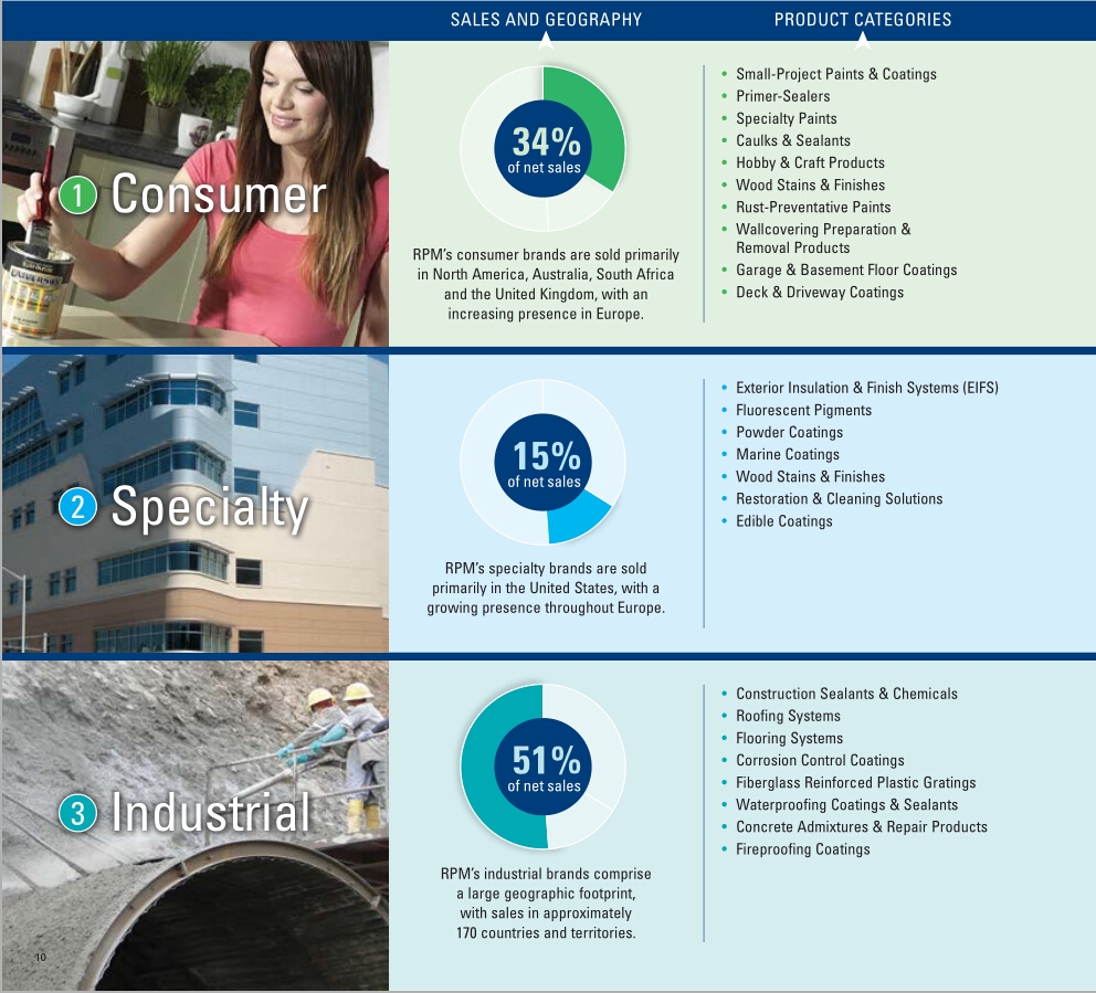 RPM表示,将继续扩大全球足迹,特别是在欧洲经济体和如拉丁美洲、印度、中国等新兴高增长市场的建设。推动这一扩张的主要措施包括收购、合资企业、经营单位之间的合作关系,并建立新的销售办事处。