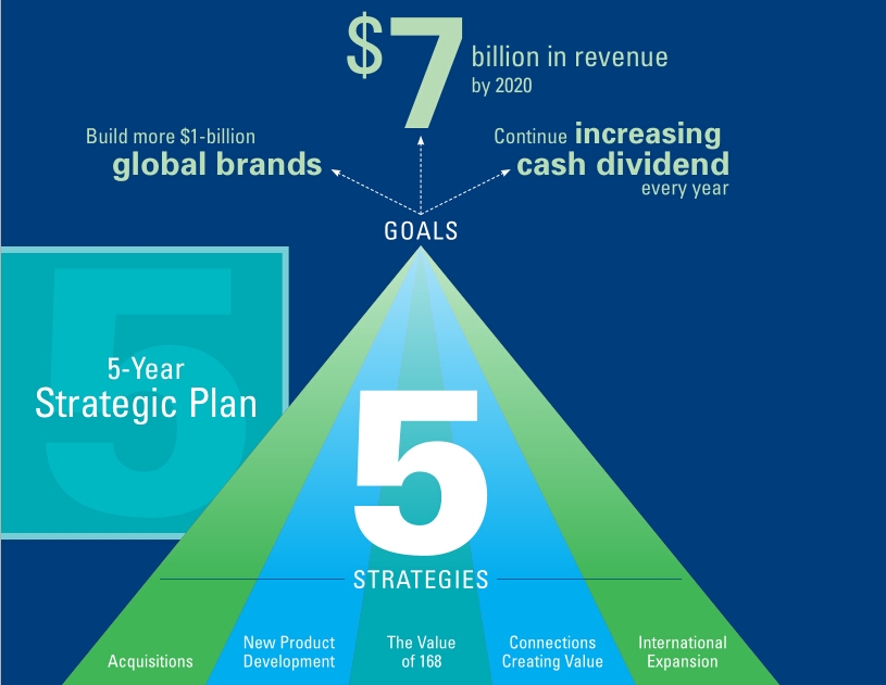 同时,RPM还制定了“五年战略计划”,到2020财年销售收入预计将达到70亿美元的目标,建设超过10亿美元的全球品牌和继续连续增加现金分红。确定了五个主要的策略,是其持续成功的关键,其中包括收购、新产品研发、价值168、连接创造价值、海外扩张。