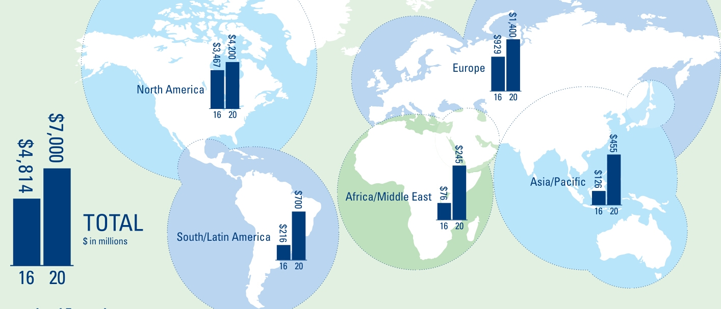 根据报告显示,立帕麦各个销售区域销售收入从2016财年到2020财年预计都将得到增长,其中北美地区从2016财年的34.67亿美元增加到2020财年的42.00亿美元;欧洲地区从2016财年的9.29亿美元增加到2020财年的14.00亿美元;南美洲、拉丁美洲地区从2016财年的2.16亿美元增加到2020财年的7.00亿美元;亚太地区从2016财年的1.26亿美元增加到2020财年的4.55亿美元;非洲和中东地区从2016财年的0.76亿美元增加到2020财年的2.45亿美元。