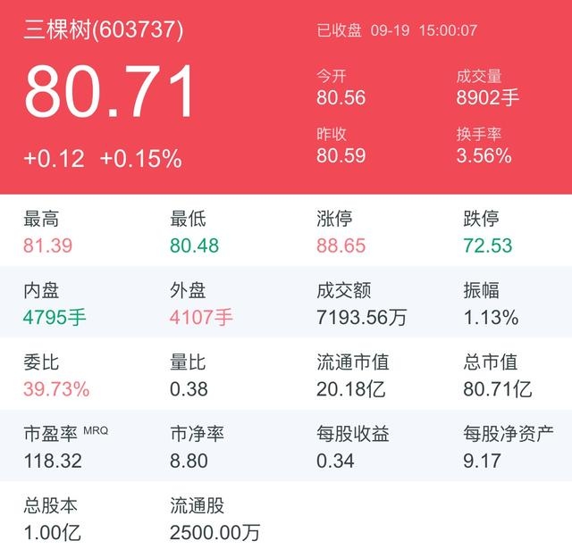 三棵树(603737)于2016年6月3日在上海证券交易所主板上市交易,成为了中国民营涂料第一股。到6月29日,三棵树总市值突破百亿元。截止到2016年9月19日,三棵树总市值为80.71亿元。(涂界)