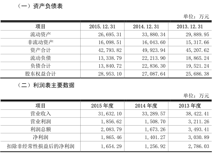 招股书显示,公司2013-2015年度,分别实现营业收入3.84亿元、3.33亿元和3.16亿元,营业收入连续下滑。与此同时,公司的净利润也增长缓慢,2013-2015年分别实现净利润约3031万元、1401万元和1865万元,在2014年同比下滑了53.78%,在2015年同比又上涨了33.13%,波动较大。