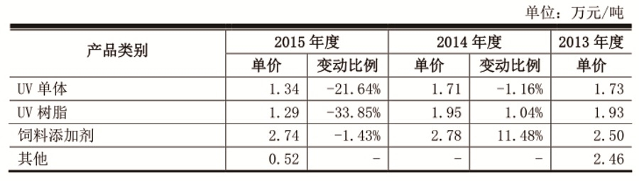 招股书显示,公司三大主营产品中,UV单体产品的销售价格2013-2015年分别为1.73万元/吨、1.71万元/吨和1.34万元/吨,该产品营业收入占2015年总营收的52.49%,为第一大主营,公司此次的募投项目也主要是拓展这块业务的领域。同时,UV树脂产品的销售价格2013-2015年分别为1.93万元/吨、1.95万元/吨和1.29万元/吨,该产品营业收入占2015年总营收的15.91%。饲料添加剂产品的销售价格2013-2015年分别为2.5万元/吨、2.78万元/吨和2.74万元/吨,该产品收入占2015年总营收的29.91%。