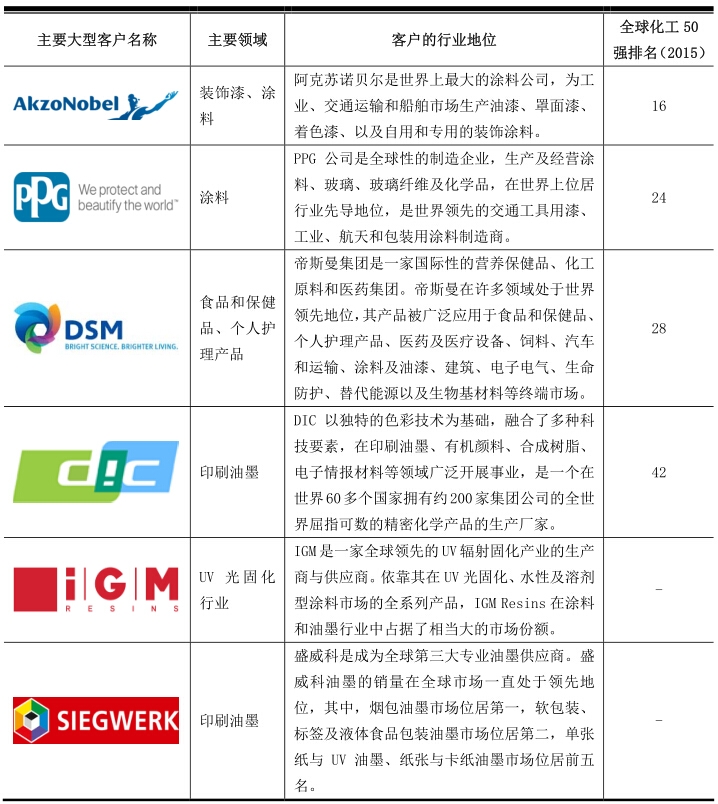 利田科技表示,UV光固化产品和饲料抗氧化剂产品要进入下游优质客户的供应链体系,都要经过长期严格的认证过程,而一旦通过这些优质客户的认证,彼此之间会形成稳固的长期合作关系,继而为公司带来更多的竞争优势:一方面公司凭借优质的产品和良好的服务,可以逐步提高同类产品在客户采购中所占的比重;另一方面,公司通过与优质客户的长期合作,可以逐步增加向客户提供的产品种类,从而获得新的业务机会。本公司通过长期努力所建立起来的优质客户群体是公司核心竞争优势之一。公司现有阿克苏诺贝尔、PPG等大型客户群体。