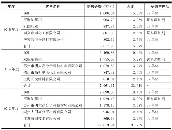 招股书称,公司辐射固化产品的消费群体主要是竹木地板漆、家具漆、汽车修补漆、塑料件涂层、电子设备表面涂层、纸张油墨、烟包酒标油墨的生产企业。饲料添加剂的消费群体主要是饲料、鱼粉、维生素的生产企业。2013年度至2015年度,公司向前五名客户的销售收入合计占营业收入总额的比例分别为31.26%、23.91%、15.87%。(涂界)