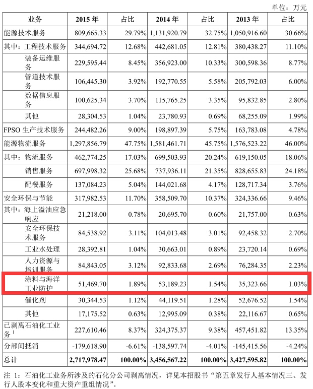 招股书显示,2015年,常州涂料研究院公司总资产为42877.14万元,净资产为32055.50万元,净利润为3739.03万元。2013年-2015年销售收入分别为35323.66万元、53189.23万元、51469.70万元,分别占海油发展总收入的1.03%、1.54%、1.89%。
