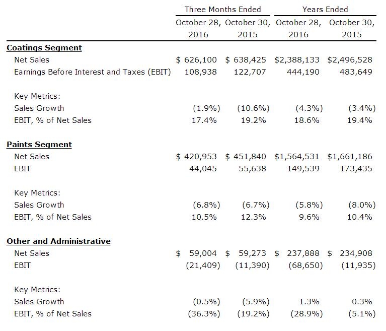 2016财年净收入3.53亿美元包括以下税后项目的影响:重组和其他资产相关费用约为1900万美元,与Sherwin-Williams公司合并建议的费用约为1800万美元,收购费用约100万美元。总体而言,这些项目对2016年财政年度的每股收益减少约0.46美元。2015净收入为4亿美元,包括以下税后物品的影响:出售某些资产的收益约为3700万美元,重组费用约为1500万美元,收购费用约为400万美元。总体而言,这些项目对2015产生积极影响,每股收益减少约0.23美元。