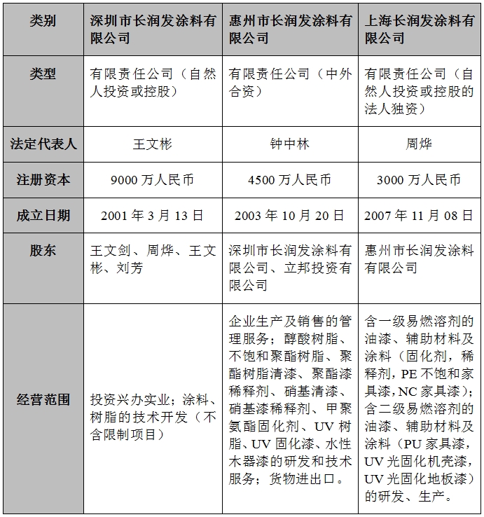 资料显示,长润发深圳(长润发涂料集团),成立于1999年,法定代表人为王文彬董事长,主要从事木器涂料的研发、生产和销售,其中王文彬拥有78%的股权,其他董事会成员拥有22%的股权。
