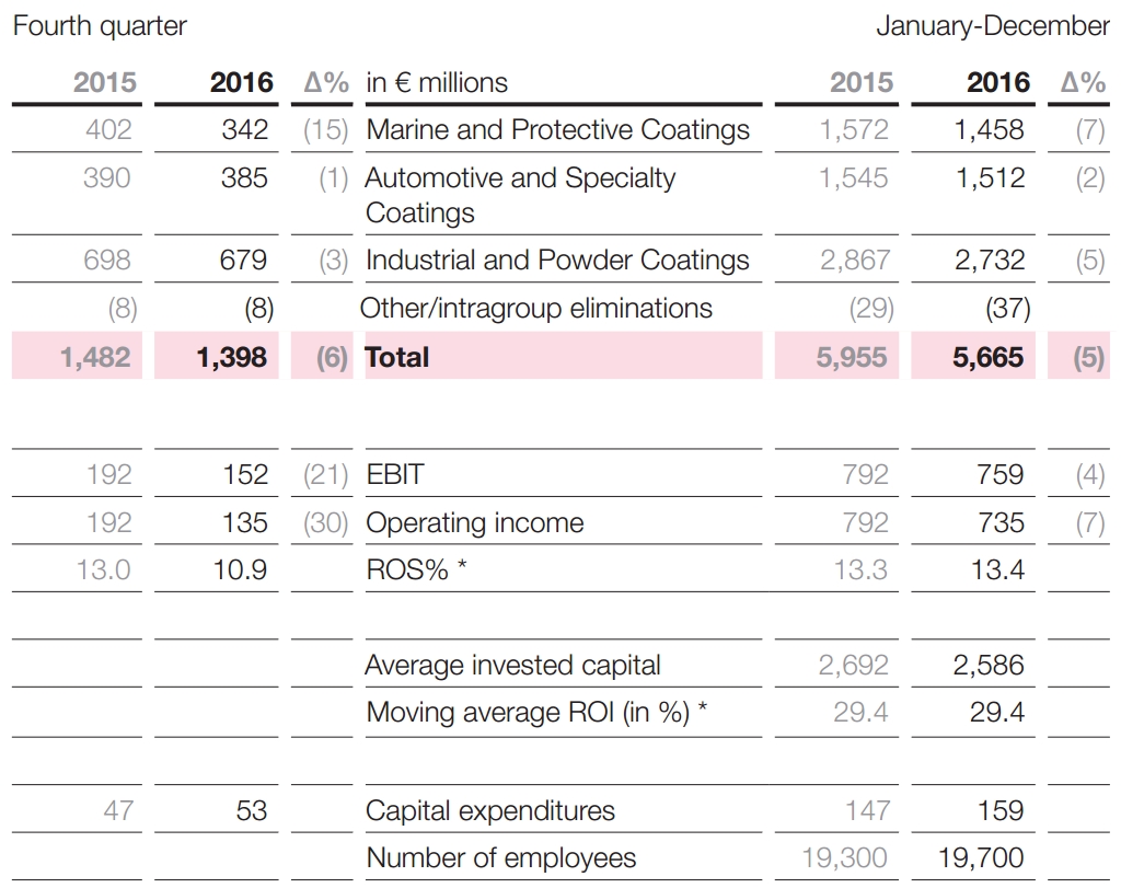报告显示,全年产量同比提高1%,装饰漆业务同比增加3%,特种化学品同比增加1%,高性能涂料同比增加1%。总收入同比下降4%,由于不利的货币和价格/组合效应。息税前利润上升3%,为15.02亿欧元,反映了销量增长,持续改进和降低成本的积极影响。盈利增加,创纪录水平的ROS为10.6%(2015年:9.8%),投资回报率为15.0%(2015年:14.0%)