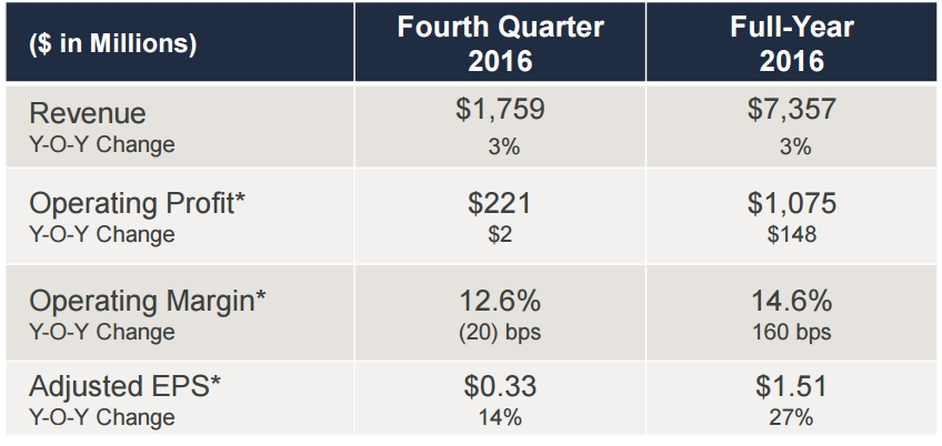 报告显示,2016年销售额同比增长了3%,达到73.57亿美元;以当地货币计算,销售额同比增长了4%,其中以当地货币计算,北美销售额增长3%,国际销售额增长6%。净利润为4.91亿美元,同比增长27.7%。调整后的息税折旧摊销前利润(EBITDA)为12.09亿美元,同比增长12.82%。毛利率从31.5%提高到33.4%,营业利润率从12.8%提高到14.3%。