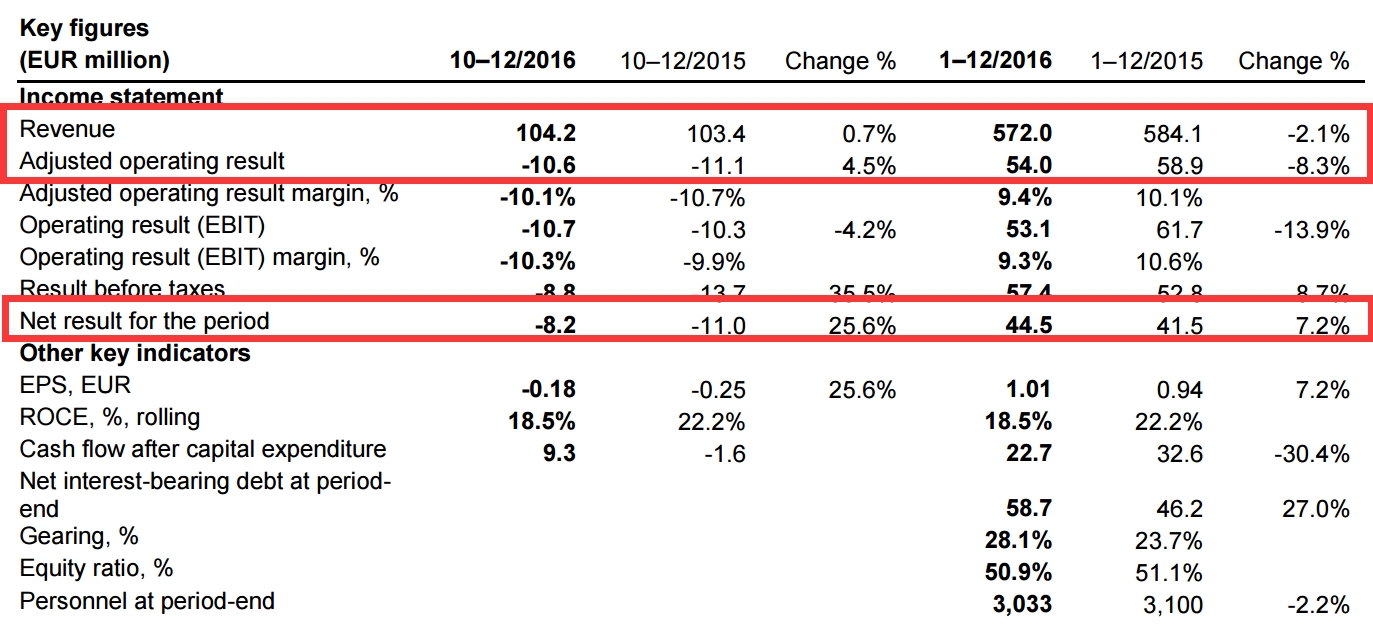 2月9日,芬兰迪古里拉(Tikkurila)发布了2016年度报告,全年实现销售收入为5.72亿欧元,约6.021亿美元,同比下降2.1%。调整后营业利润为5400万欧元,同比下降8.3%。营业利润(EBIT)为5310万欧元,同比下降13.9%。净利润为4450万欧元,同比增长7.2%。每股收益为1.01欧元,2015年为0.94欧元;资本支出后的现金流为2270万欧元,2015年为3260万欧元。