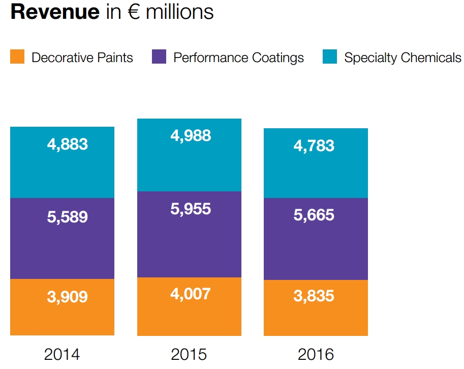 财报显示,阿克苏诺贝尔2016年实现销售收入141.97亿欧元,约149.878亿美元,同比下降4%。其中,专业化学品业务、高性能涂料业务、装饰涂料业务销售收入分别为47.83亿欧元、56.65亿欧元、38.35亿欧元。