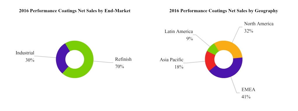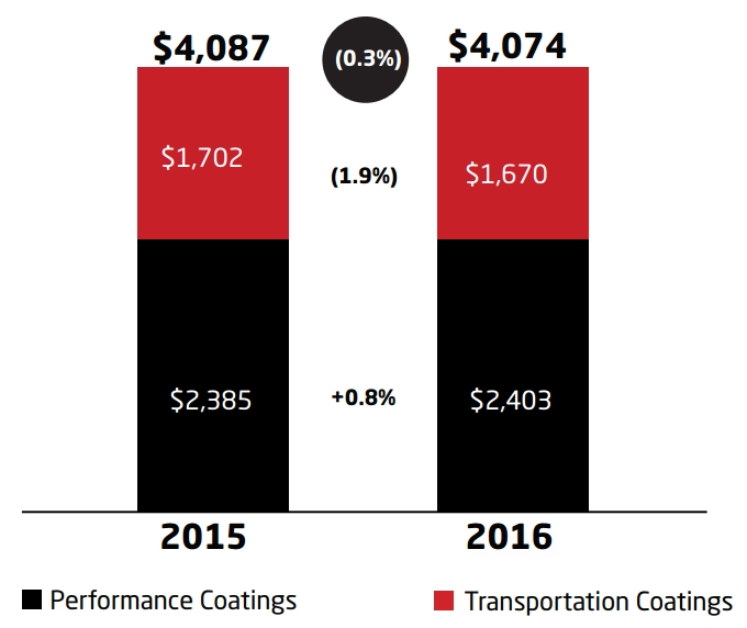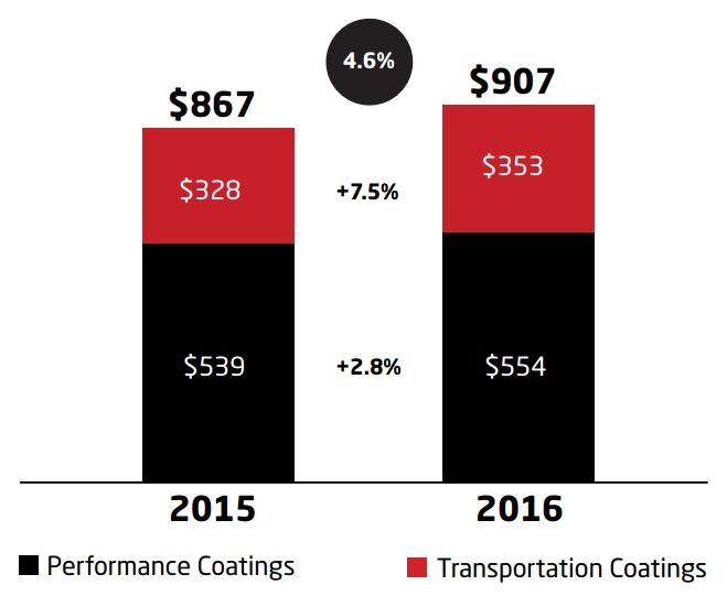艾仕得高性能涂料部门,2016财年净销售额为24亿美元,同比增长0.8%。该部门主要为零散和本地客户群提供高品质的液体和粉末涂料解决方案。其终端市场是汽车修补漆和工业涂料。
