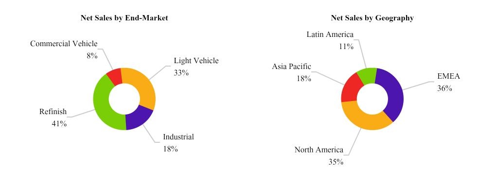 财报显示,按销售额来看,汽车修补漆、工业涂料销售额占高性能涂料部门比分别为70%、30%。按地理来看,EMEA(欧洲、中东和非洲)、北美地区、亚太地区、拉丁美洲地区的销售额分别占比为41%、32%、18%、9%。