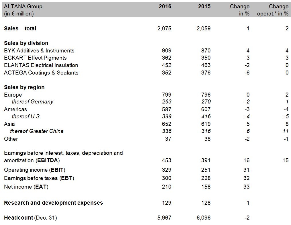 3月17日,特种化学品集团德国阿尔塔纳(ALTANA)公布了2016财年报告,全财年实现销售额20.75亿欧元,同比增长1%。根据收购和汇率影响调整,销售额同比增长2%。利息、税收、折旧和摊销前的收益(EBITDA)同比增长了16%,达到4.53亿欧元。净利润为2.1亿欧元,同比增长33%。
