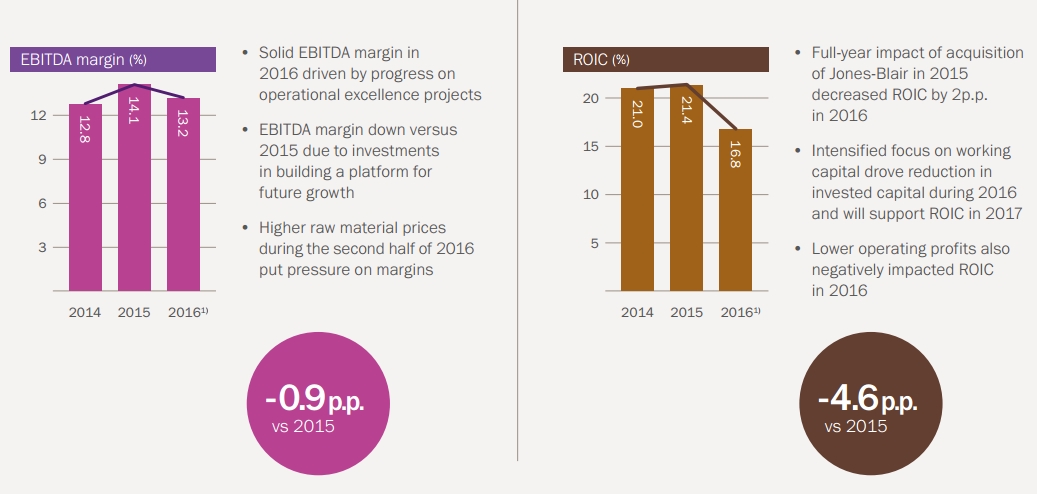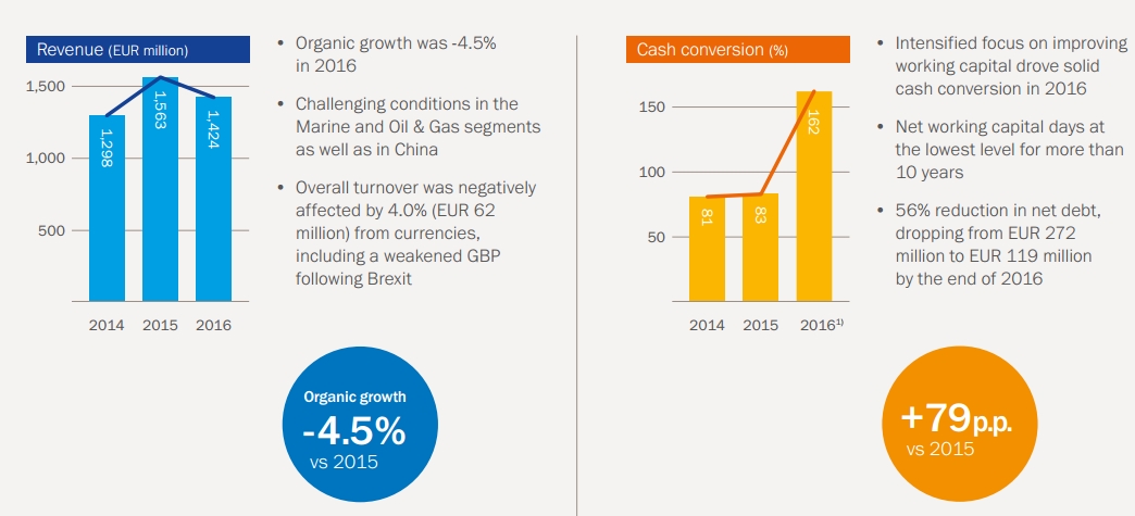 许多行业中越来越多不确定的宏观经济情况—例如船舶、石油及天然气行业 — 在2016年影响着本集团的客户,同时也影响着集团的整体绩效。集团营业额为14.24亿欧元,相当于负的有机增长4.5%。