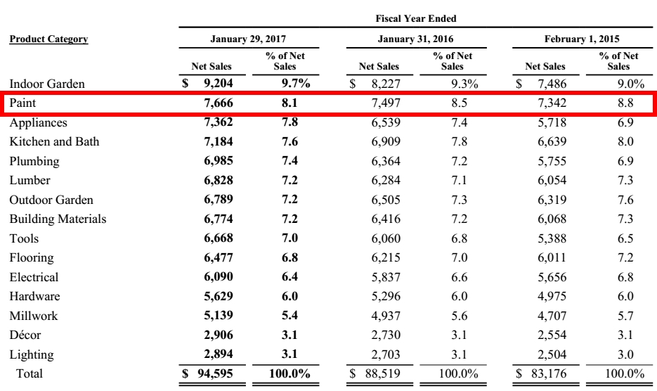 2013财年-2016财年涂料业务销售额分别为70.18亿美元、72.99亿美元、74.65亿美元、76.66亿美元,分别同比增长8.9%、8.8%、8.4%、8.1%。据了解,百色熊、PPG等大型涂料企业通过家得宝对外销售。