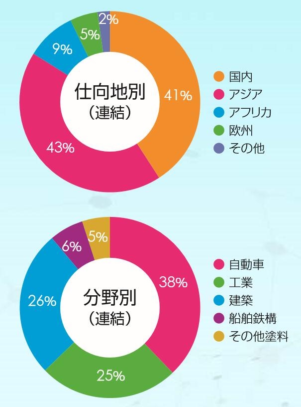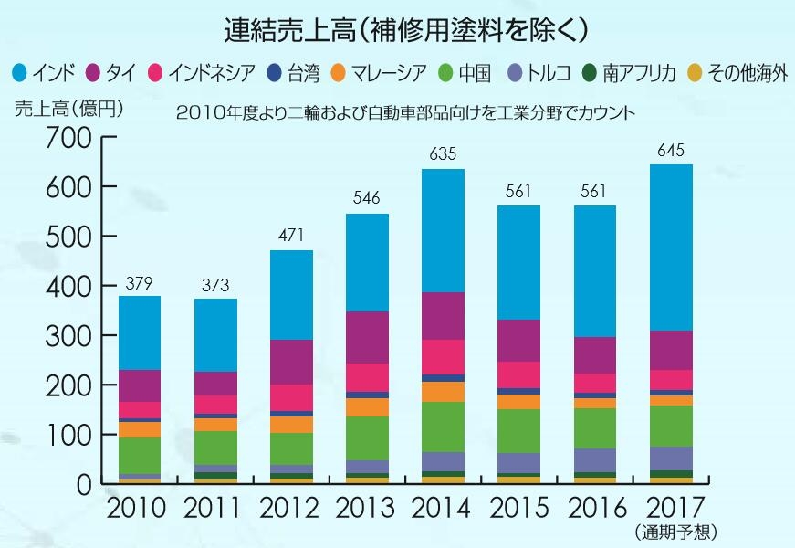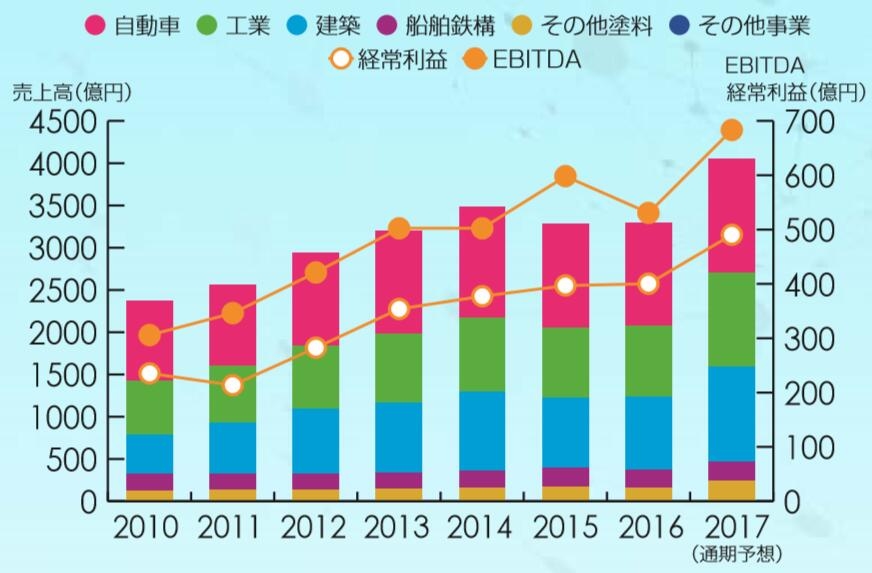 汽车用的领域(修补漆)2016年销售额为194亿日元,同比下降1.4%;预计2017年销售额为240亿日元,同比增长23.9%。主要是收购Helios涂料集团等因素。