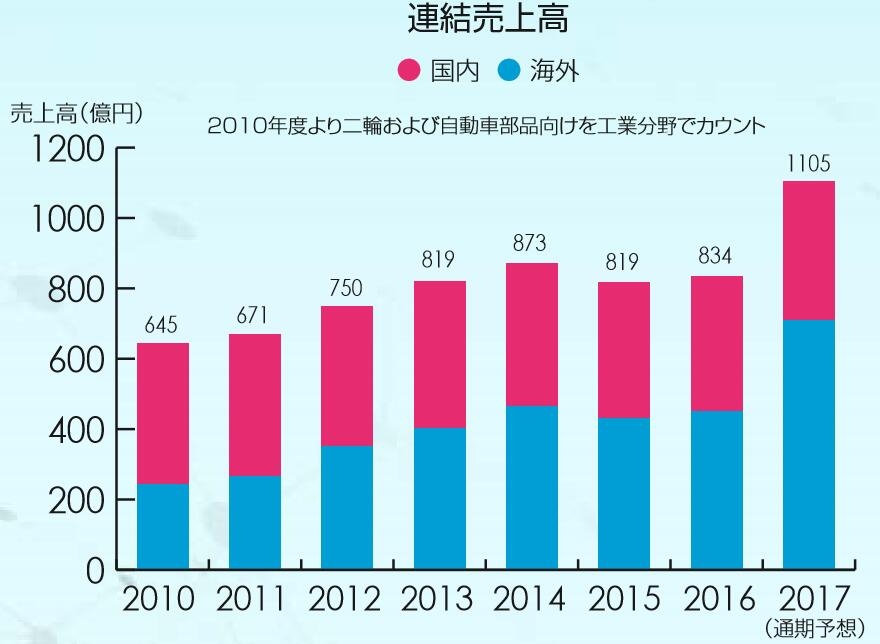 工业涂料2016年销售额为834亿日元,同比下降1.9%;预计2017年销售额为1105亿日元,同比增长32.4%。主要是收购Helios涂料集团等因素。