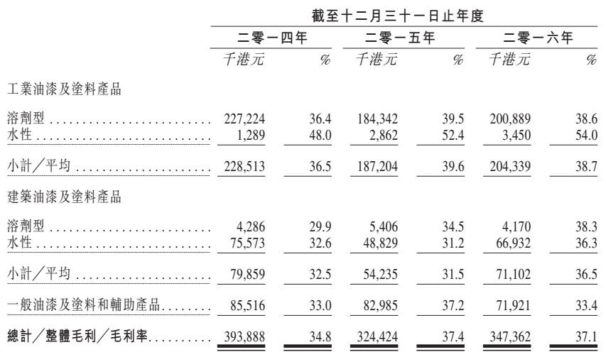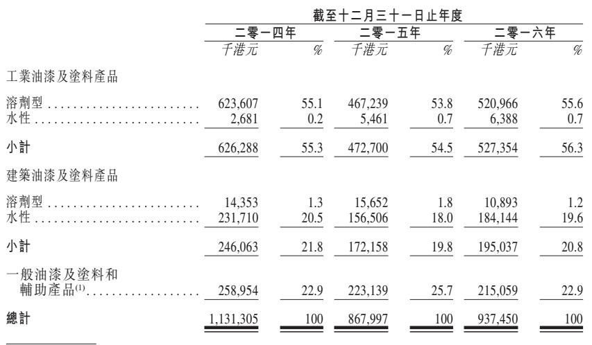 材料显示,一般涂料及辅助产品业务2014年-2016年销售收入分别为2.58954亿港元、2.23139亿港元、2.15059亿港元;分别占总收入的22.9%、25.7%、22.9%。