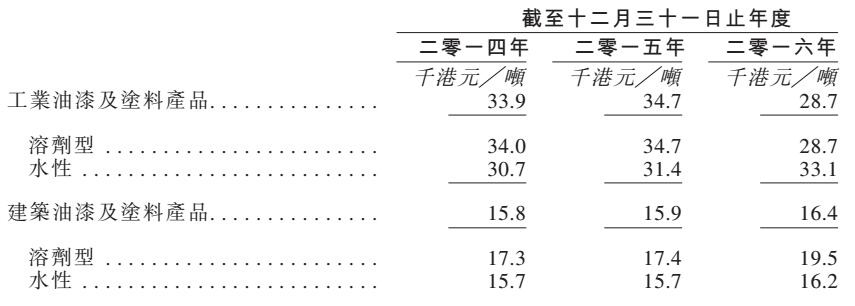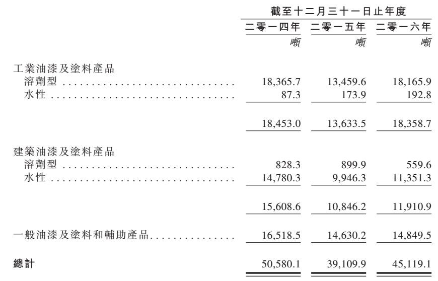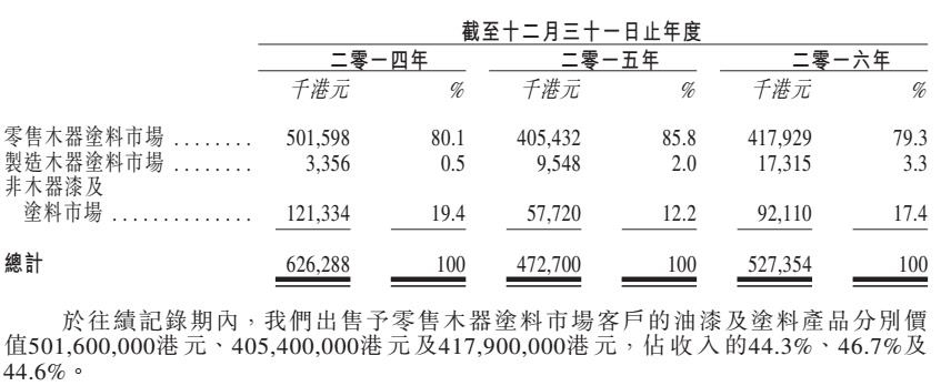 材料显示,工业涂料业务2014年-2016年销售收入分别为6.26288亿港元、4.727亿港元、5.27354亿港元,分别占总收入的55.3%、54.5%、56.3%。