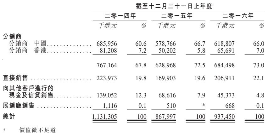 报告显示,2017年已于229名中国分销商重续年度分销协议,而该等分销商占集团向中国分销商进行销售所产生总收入的87%。于往期记录期内,分别与272名、300名和283名照顾分销商订立年度分销协议,分别带来6.247亿港元、5.373亿港元及5.514亿港元的收入。