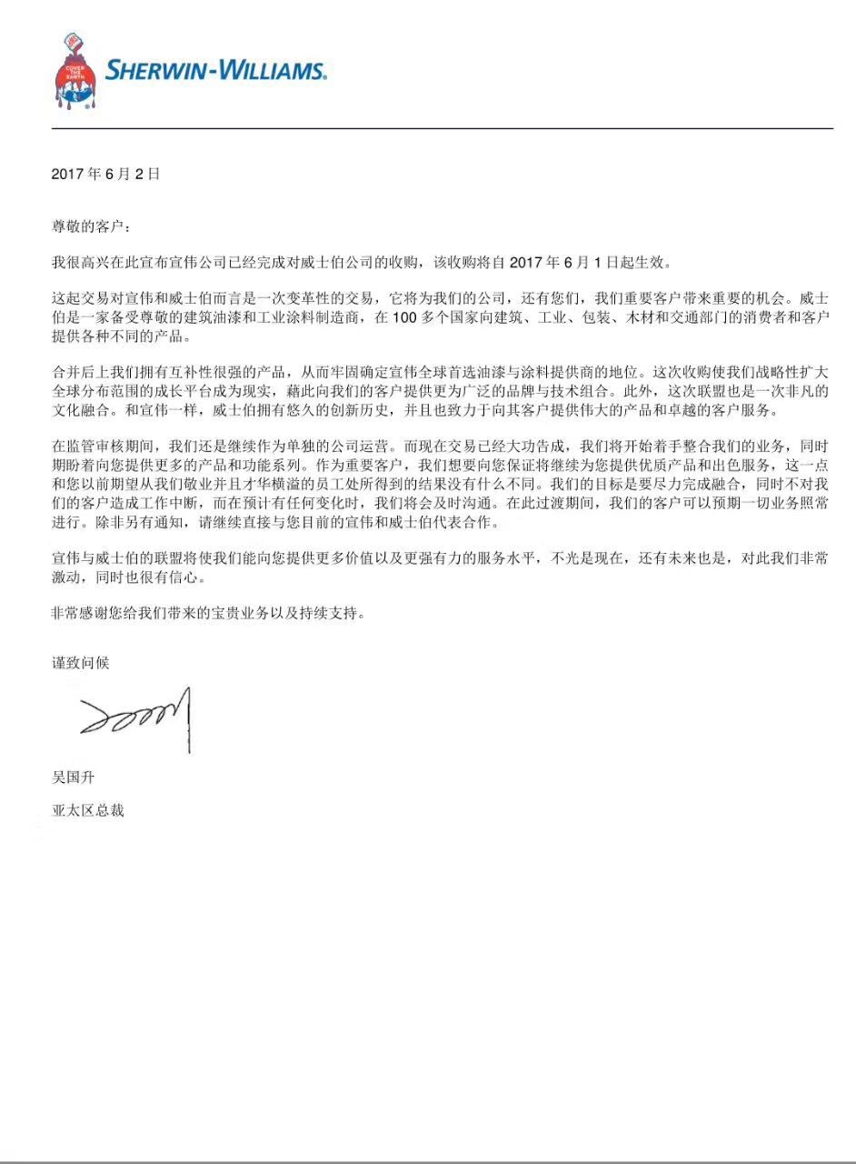 吴国升信中表示,合并后上我们拥有互补性很强的产品,从而牢固确定宣伟全球首选油漆与涂料提供商的地位。这次收购使我们战略性扩大全球分布范围的成长平台成为现实,藉此向我们的客户提供更为广泛的品牌与技术组合。此外,这次联盟也是一次非凡的文化融合。和宣伟一样,威士伯拥有悠久的创新历史,并且也致力于向其客户提供伟大的产品和卓越的客户服务。