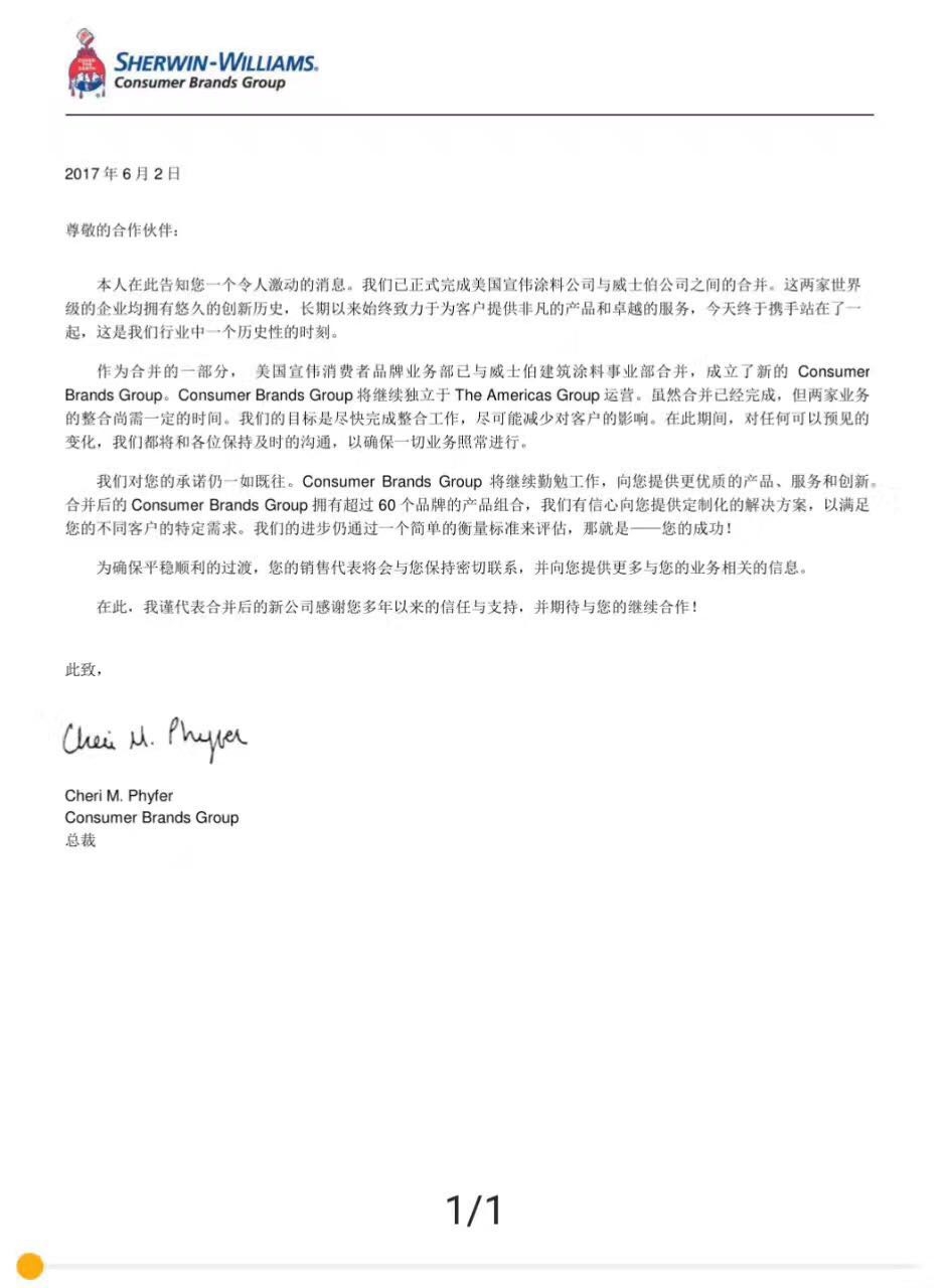 6月2日,宣伟消费品牌集团(Congsumer Brands Group)总裁Cheri M.Phyfer也向客户发出信件,并在信中说,本人在此告知您一个令人激动的消息。我们已经正式完成美国宣伟涂料公司与威士伯公司之间的合并。这两家世界级的企业均拥有悠久的创新历史,长期以来始终致力于为客户提供非凡的产品和卓越的服务,今天终于携手含在了一起,这是我们行业中一个历史性的时刻。
