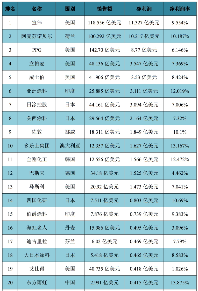 榜单显示,宣伟以11.327亿美元的净利润坐上最赚钱榜冠军宝座,阿克苏诺贝尔、PPG分别位居第2、3位,净利润分别为10.217亿美元、8.77亿美元。中国唯一上榜的涂料企业为东方雨虹,以0.415亿美元的净利润排名第20位。