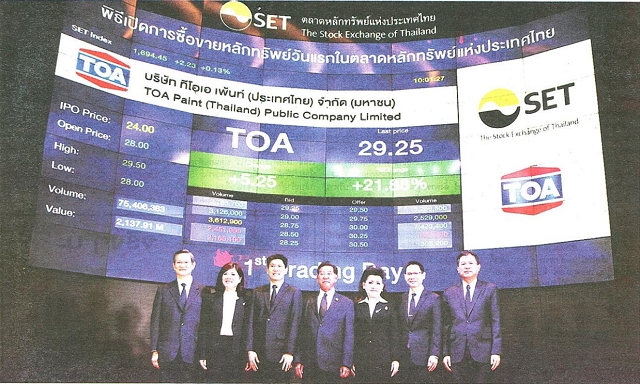 2017年10月10日,泰国最大的装饰涂料生产商TOA公司正式在泰国证券交易所上市。TOA公司发行价为24泰铢/股,首日开盘价28泰铢。据悉,交易首日出现涨停,报32.50泰铢,涨幅达35.42%,首日交易额为126亿泰铢。首日市值为487亿泰铢(约合14.3亿美元)。