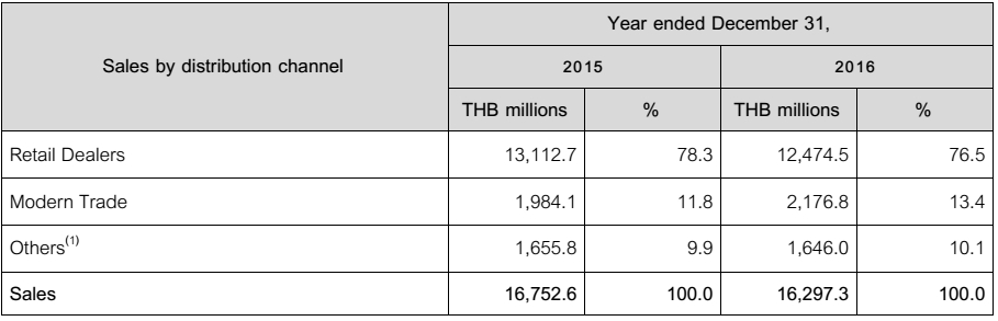 按销售渠道来看,TOA集团零售渠道2015-2016年销售收入分别为131.127亿泰铢、124.745亿泰铢,占比分别为78.3%、76.5%;现代贸易渠道销售收入分别为19.841亿泰铢、21.768亿泰铢,占比分别为11.8%、13.4%;其他渠道销售收入分别为16.558亿泰铢、16.460亿泰铢,占比分别为9.9%、10.1%。