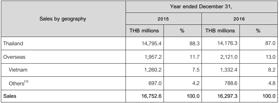 按销售区域来看,TOA集团泰国地区2015-2016年销售收入分别为147.954亿泰铢、141.763亿泰铢、占比分别为88.3%、87.0%;海外地区销售收入分别为19.572亿泰铢、21.210亿泰铢,占比分别为11.7%、13.0%,其中:越南地区售收入分别为12.602亿泰铢、13.324亿泰铢,占比分别为7.5%、8.2%。