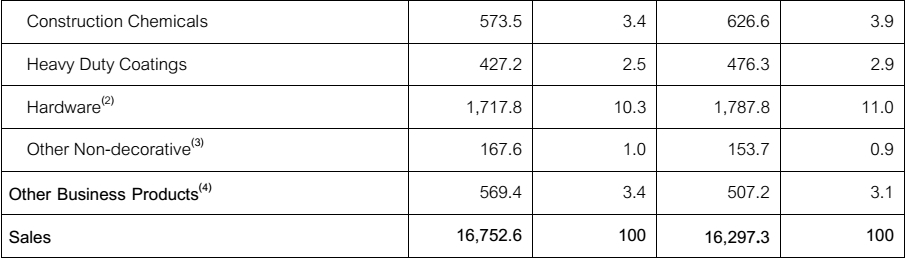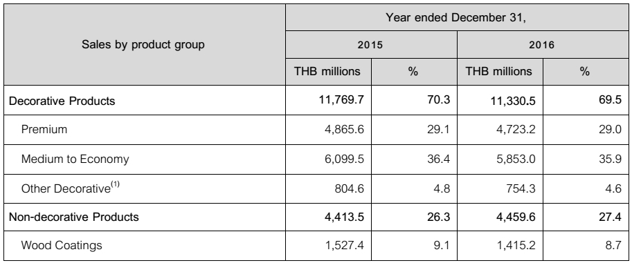 按销售产品来看,TOA集团装饰涂料产品2015-2016年销售收入分别为117.697亿泰铢、113.305亿泰铢,占集团销售额比例分别为70.3%、69.5%;非装饰漆产品销售收入分别为44.135亿泰铢、44.596亿泰铢,占集团销售额比例分别为26.3%、27.4%(木器漆销售额分别为15.274亿泰铢、14.152亿泰铢,占比分别为9.1%、8.7%);其他业务销售收入分别为5.694亿泰铢、5.072亿泰铢,占集团销售额比例分别为3.4%、3.1%。