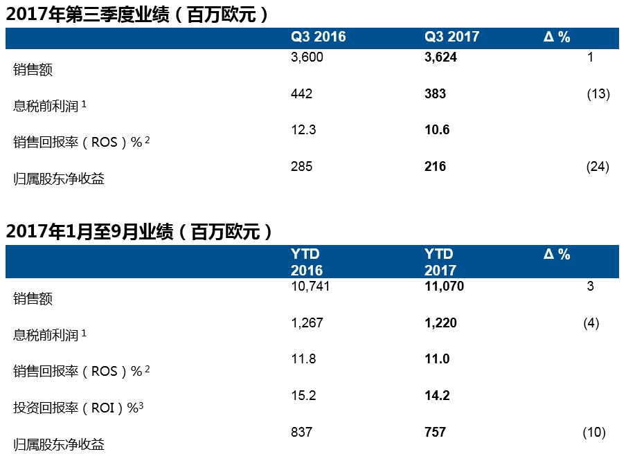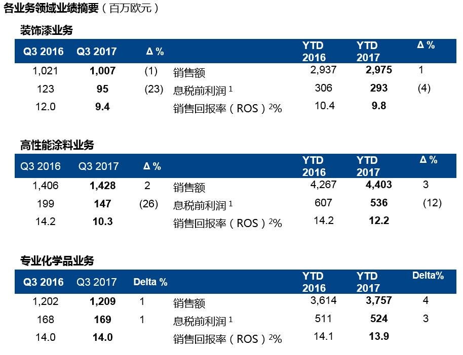 10月18日,阿克苏诺贝尔(AkzoNobel)发布2017年第三季度业绩,前三季度实现销售额110.7亿欧元,同比增长3%;息税前利润为12.2亿欧元,同比下降4%;归属股东净收益为7.57亿欧元,同比下降10%。